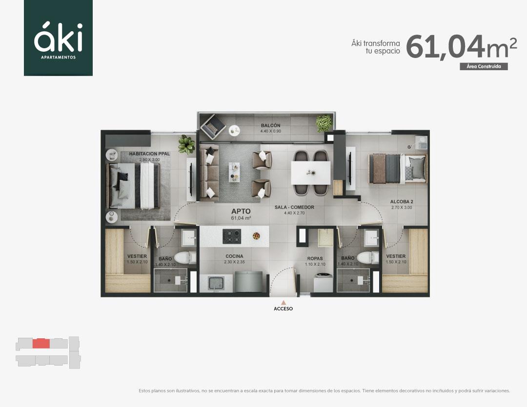Los detalles importanÁki es un proyecto de apartamentos en Bello diseñado especialmente para quienes buscan su propio espacio, transformando sus áreas y espacios, personas que valoran la naturaleza, la sostenibilidad, las mascotas y sobre todo para quienes saben que comprar vivienda es una gran inversión. Proyecto de 3 torres con 8 apartamentos por nivel en áreas de: 47m2 (1 Alcoba o posibilidad de 2da) / 2 aptos por nivel. 61,35m2 (2 o 3 alcobas) / 4 aptos por nivel. 61,9m2 (1 alcoba con amplio espacio social o 2da alcoba + estudio) / 2 aptos por nivel. El proyecto estará ubicado contiguo a nuestro proyecto Flor sector Plaza Fabricato una zona de gran valorización y localizado estratégicamente por la facilidad de múltiples vías, futuro centro comercial y sistema de transporte público. Unidad cerrada con biciparking, 2 salones coworking, salón social, salón audiovisual, piscina de adultos y niños, solárium, gimnasio, zona work fit, juegos infantiles, zona de mascota, cicloruta, cancha recreativa, zona de picnic, zona BBQ, zona de yoga, zonas verdes y el plus de zona de lavandería por torre.
